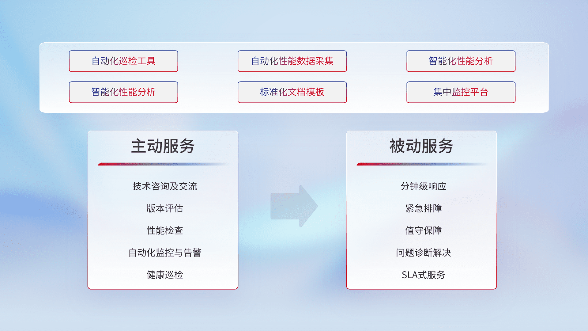 智能化工具和标准化文档,,保障服务质量,,提供主动服务(包含技术咨询、、版本评估、、、、性能检查、、自动化监控与告警、、健康巡检)和被动服务包含(分钟级响应、、、紧急排障、、、、值守保障、、问题诊断解决、、、、SLA服务)。。。。
